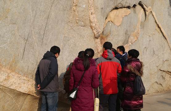 在结束了孟良崮战役纪念馆和孟良崮战役遗址参观学习之后,地质系教师于27日对泰山地下大裂谷进行了地质考察,在感受大自然鬼斧神工的同时,更是在戴俊生教授和陈清华教授的指导下,对地下大裂谷的成因、钟乳石的结构、节理的性质、走向及区域构造应力场背景等进行了详细的讨论,丰富了地质知识,特别是培养了青年教师的野外地质技能,增强了对碳酸盐岩岩溶及变质岩构造的认识。(作者:王健,吴孔友;照片由戴俊生教授提供)