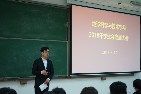 3月10日下午,我院在南教110举行地学院2018年学生会换届大会。党委副书记徐永涛、团委书记霍宁宁、全体辅导员老师、各学生组织主席团成员参加了此次会议并担任评委。