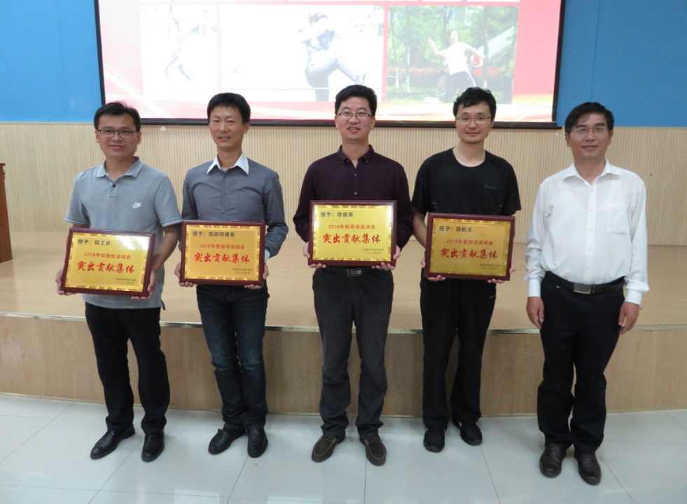 大会伊始,全体与会师生通过视频再次回顾了运动健儿在这一年的各类体育活动中的精彩瞬间。2017-2018年,地院师生发扬勘探精神,不畏强手,顽强拼搏,取得优异成绩。在运动会中学生代表队获得男子甲组(本科生)和男子乙组(研究生)两项第一名,女子甲、乙组和团体甲、乙组均获得第二名的好成绩,学生代表队荣获“院长杯”;教职工代表队取得历史性突破,获得全校第一,总分达214.5,同时荣获“体育道德风尚奖”。在青年健身节中,学生男排荣获第一名、学生女排荣获第一名、学生男足荣获第一名,羽毛球荣获团体第二名,乒乓球荣获团体第二名,学院荣获青年健身节团体总分第一名。在刚结束的“校庆杯”2018年教工排球赛中,我院教职工男子排球荣获第一名,实现“四连冠”。