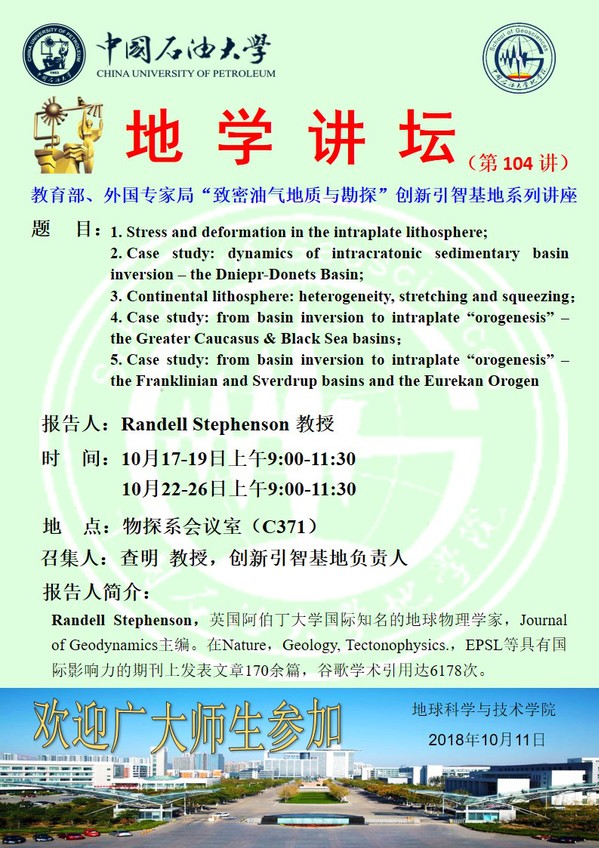 【地学讲坛第104讲】英国阿伯丁大学Randell Stephenson教授系列学术讲座的通知