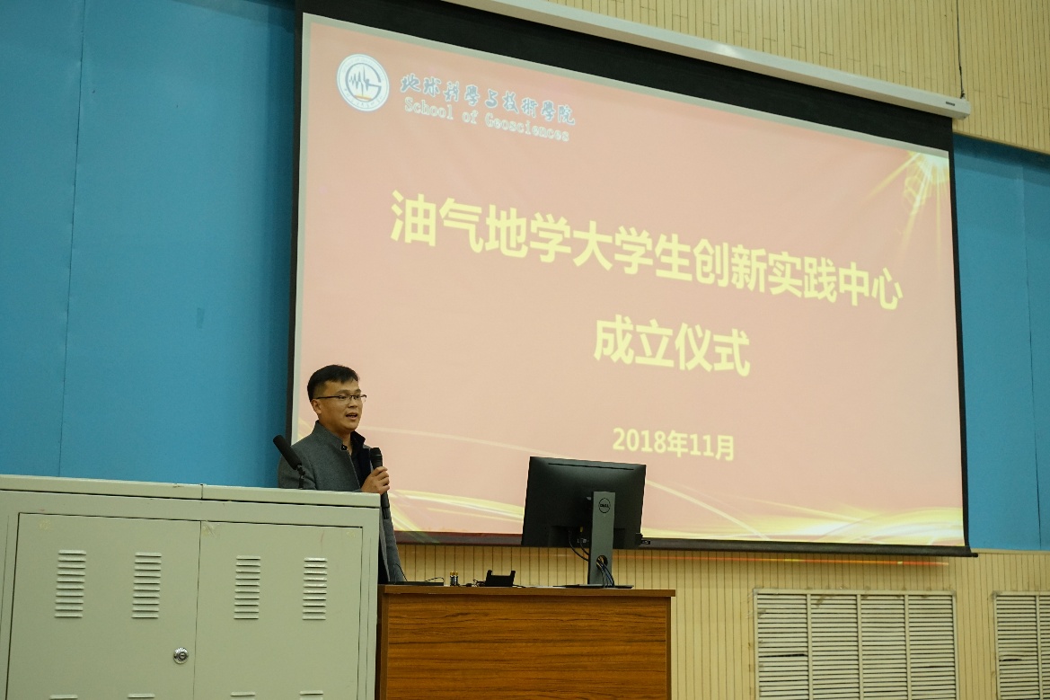 11月24日下午,油气地学大学生创新实践中心成立仪式在南教楼100号举行,教务处副处长刘臻、地学院党委书记张卫东、副院长吴智平、院属各单位主要负责人和6位学科竞赛指导老师出席仪式,地学院党委副书记徐永涛主持仪式。