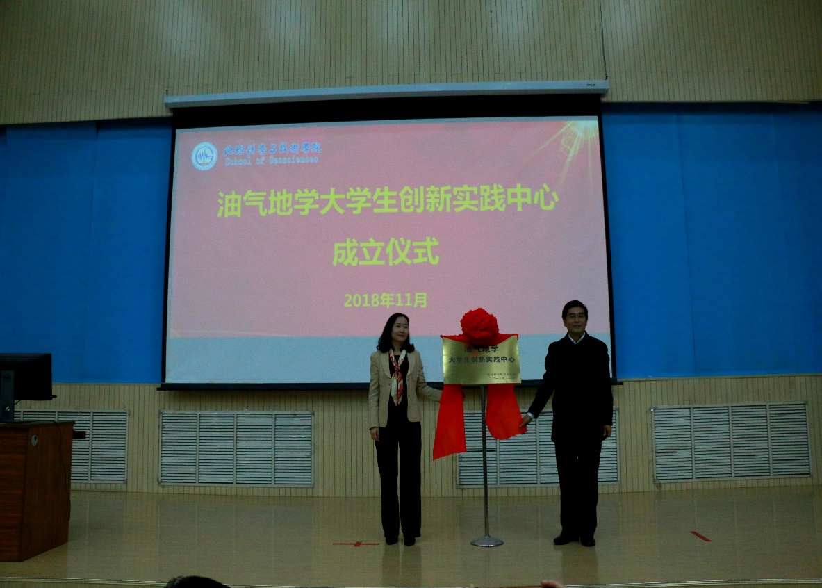 副院长吴智平宣读油气地学大学生创新实践中心成立决定和中心人员任命决定。随后,党委书记张卫东和教务处副处长刘臻为中心揭牌,标志油气地学大学生创新实践中心正式成立,党委书记张卫东为中心主任、副主任颁发聘书。