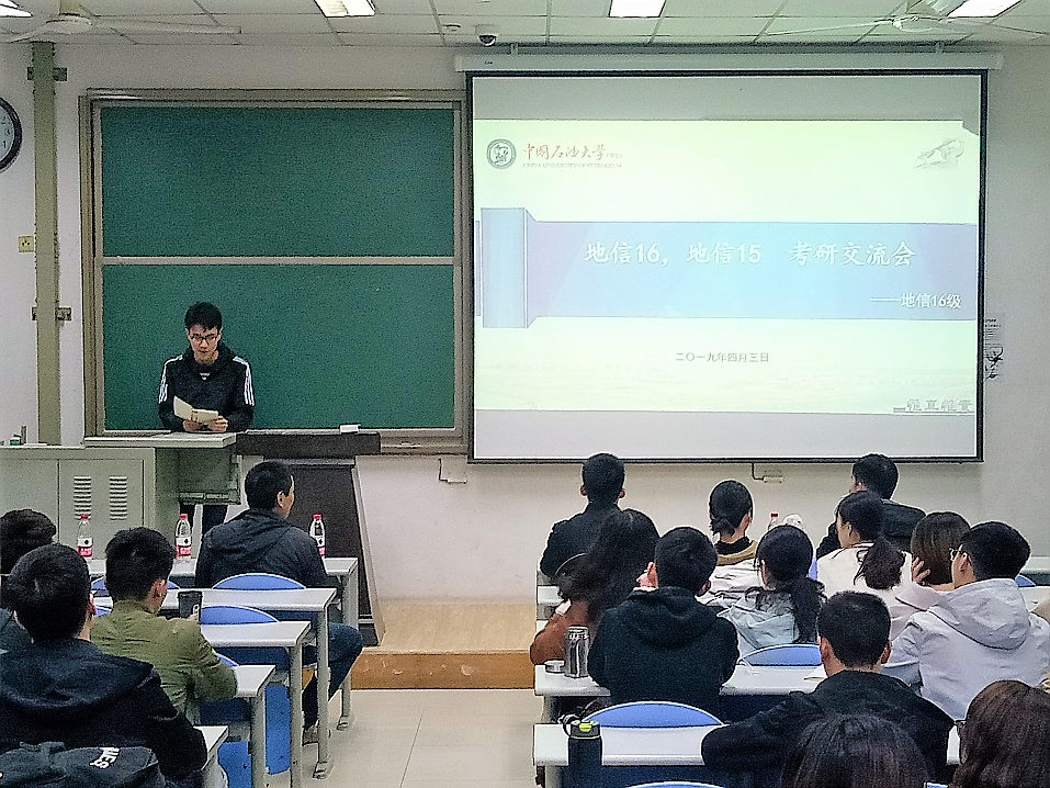 2019年4月3日晚,地信15、16级在南堂117举行了“青春正好,奋力奔跑”为题的考研交流会,地信16级全体学生参加会议,黄丙湖老师、地信15级考研学生代表出席会议。