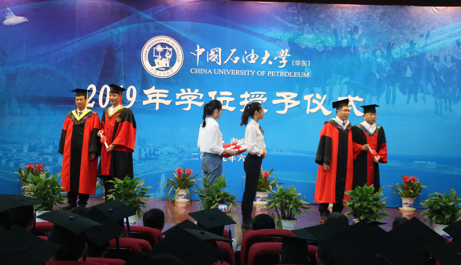 【本站讯】6月23日下午,我院2019届毕业生学位授予仪式在逸夫礼堂隆重举行。仪式由学院副院长邓少贵主持。学院学位评定分委员会主席、院长林承焰教授,学位评定分委员会委员,教授委员会主席刘可禹教授共同为386名本科毕业生和287名硕士毕业生授予学位。