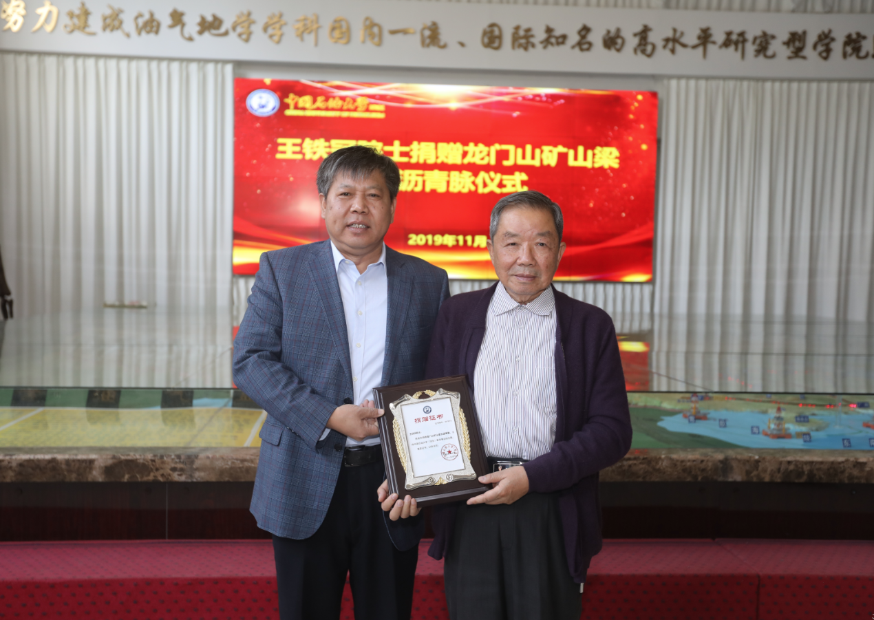【本站讯】11月2日,中国科学院院士王铁冠向学校捐赠龙门山矿山梁大沥青脉仪式举行。王铁冠院士、校长郝芳院士、副校长姚军,以及beat365唯一官方网站院长林承焰共同为龙门山矿山梁大沥青脉揭幕,郝芳代表学校接受捐赠并为王铁冠院士颁发捐赠纪念牌。