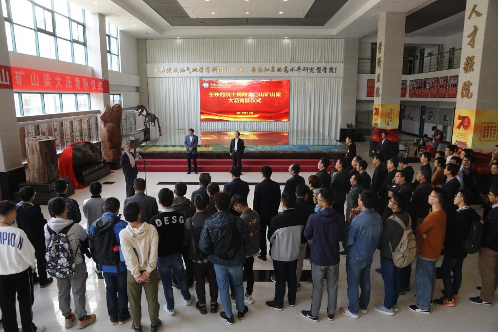 王铁冠院士为学校发展建设倾注了大量心血,在繁忙工作的同时,花费很多精力,在舜天矿业协助下, 几经周折将龙门山矿山梁大沥青脉标本从四川运至青岛。捐赠仪式上,他谈了自己与这块从数千公里外寻获的“黑石头”的机缘,说明捐赠龙门山矿山梁大沥青脉的原因:龙门山矿山梁大沥青脉是中国近代历史上发现、应用最早的沥青脉,历史价值深厚;其储量大、数量多、体积大,具有很高的研究价值。他希望,这块沥青标本能够成为石大石油地学教学中的教科书,帮助塑造石大学生学习地球科学的氛围,培养学生热爱地质的精神,打造优秀的地学文化。