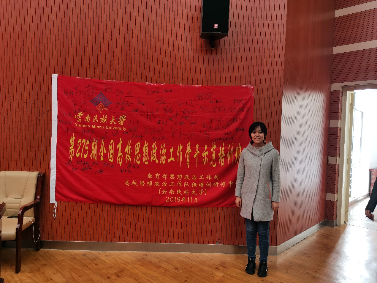 11月20-23日,教育部第275期全国高校思想政治工作骨干示范培训班在云南民族大学举行。来自全国95所高校的思想政治工作骨干教师齐聚云南昆明学习交流,我院辅导员张蕾参加了此次培训。
