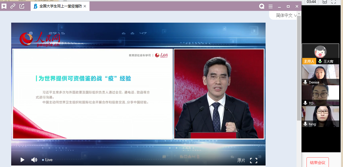 3月9日下午,由教育部社会科学司与人民网联合组织的“全国大学生同上一堂疫情防控思政大课”在人民日报社人民网“云开讲”。beat365唯一官方网站积极响应,提前一天通过QQ群、微信群、微信公众号等多种渠道进行宣传,确保通知到位。在学院各党支部、团支部广泛组织学生观看直播,开展线上讨论,强化对思政课的理解和认识,提高学生党员担当责任意识,发挥党支部的战斗堡垒作用。