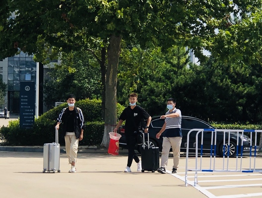 辅导员在校门口迎接返校学生