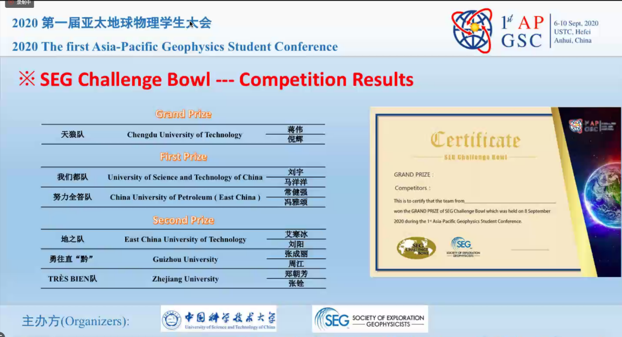 9月8日-9日,中国科学技术大学在线上举办第一届亚太地球物理学生大会暨SEG Challenge Bowl知识竞赛中国赛区决赛,来自beat365唯一官方网站、中国科学技术大学、浙江大学、中国地质大学(武汉)等13所高校的代表队参加决赛。经过激烈角逐,我院地质资源与地质工程2019级研究生常健强、冯雅颂组成的“努力全答队”获得第二名的好成绩,荣获一等奖,曹丹平老师获评优秀指导教师,beat365唯一官方网站获优秀组织奖。
