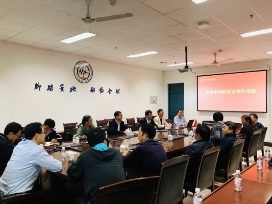 授课后,欢迎李国欣校友荣归母院座谈会在工科楼C座251会议室举行,院长林承焰、副院长邓少贵及测井系教师代表参加座谈会。