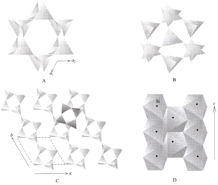 鳞石英(A)、方石英(B)、柯石英(C)和斯石英(D)晶体结构