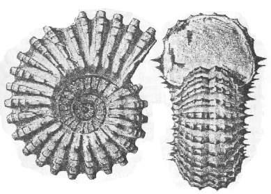 壳内卷,侧扁,具简单、粗壮的横脊连续穿过腹侧,每条横脊均分裂成许多平滑的瘤突,其上可能原有长瘤刺。不善游泳,可能很多时间生活于海底,食腐或猎食。