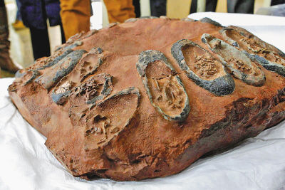 当时找到的只是两块碎蛋片,还不清楚是属于什么动物蛋的化石碎片。后来,经过对蛋片进行显微结构研究,发现其显微结构与乌龟蛋相似,因此认为那两块碎蛋片,是属于一种不知名的爬行动物的。事后不久,在法国南部白垩纪地层中,又发现了许多碎蛋片和一些大小不同、形状多样的完整蛋化石,蛋片的显微结构也与乌龟蛋相似,肯定也是属于爬行动物的蛋化石。那么,这些蛋化石是属于哪类爬行动物的呢?由于当时所发现的蛋化石直径比较大,有的直径大于20厘米,比乌龟的蛋大得多,在当时的爬行动物中,只有恐龙才能产下这样大的蛋,因此称所发现的蛋化石为恐龙蛋。此后,在世界上许多国家白垩纪地层内,又陆续发现了一些恐龙蛋化石。由于在全世界范围内发现的恐龙蛋化石的数量不多(不超过500枚),所见到的一般都是蛋的钙质外壳,极少发现保存有某种恐龙胚胎化石的蛋,很难判断所发现的蛋化石是由哪类恐龙产的。因此,在很长的一段时期内,有关恐龙蛋化石的研究工作并没有取得重要的进展。恐龙是卵生动物,通过受精孵化产生新的一代。因此,恐龙蛋化石的发现和研究,对于揭示恐龙的繁殖习性、行为、生存环境和灭绝原因具有重要的科学意义。