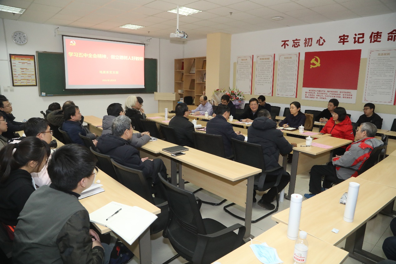 新年伊始,地质系党支部于地质系会议室开展“学习五中全会精神,做立德树人好教师”专题活动。校党委书记王勇、组织部部长张卫东、地学院党委书记刘华、副院长邓少贵、地质系党支部全体在校党员及民主党派人士等参加专题组织生活。会议由支部书记陈勇主持。