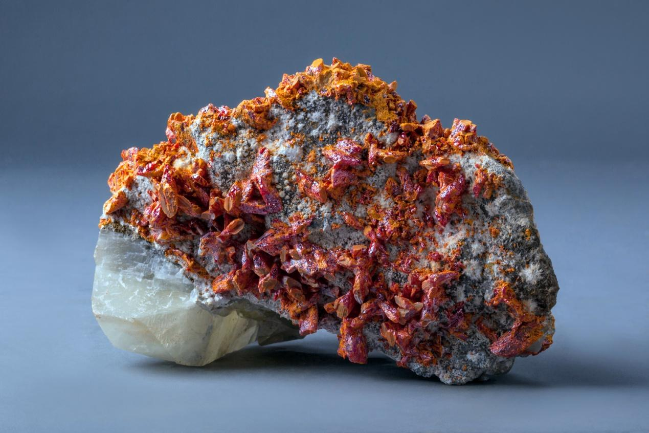 [物理性质]橘红色,条痕淡橘红色;晶面上具金刚光泽,断面上出现树脂光泽,透明至半透明。解理平行{010}完全。硬度1.5-2。相对密度3.6。性脆。长期受光作用,可转变为淡橘红色粉末。