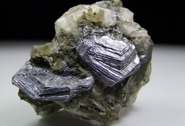 [鉴定特征]铅灰色,柱状晶形,柱面上有纵纹(聚形纹),解理面上有横纹.(聚片双晶纹)。对于细粒的块体,滴KOH于其上,立刻呈现黄色,随后变为橘红色,以此区别于与其类似的辉铋矿。