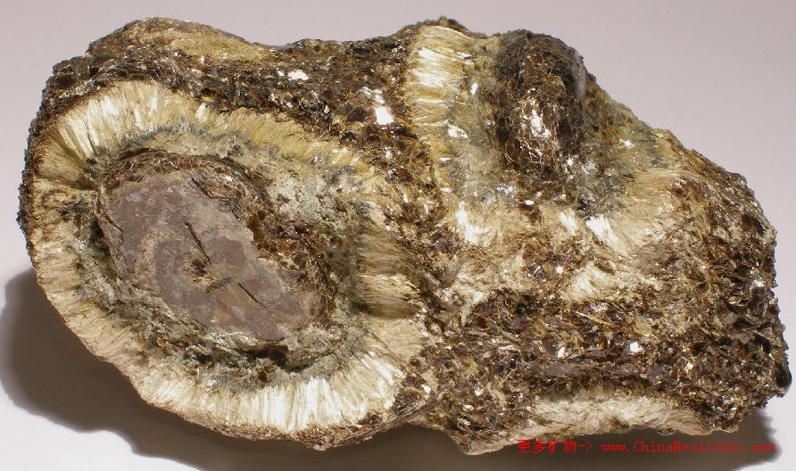 蛭石(vermiculite) (Mg,Ca)0.3-0.45(H2O)n{(Mg,FeIII,A1)3[(Si,Al)4O10](OH)2}