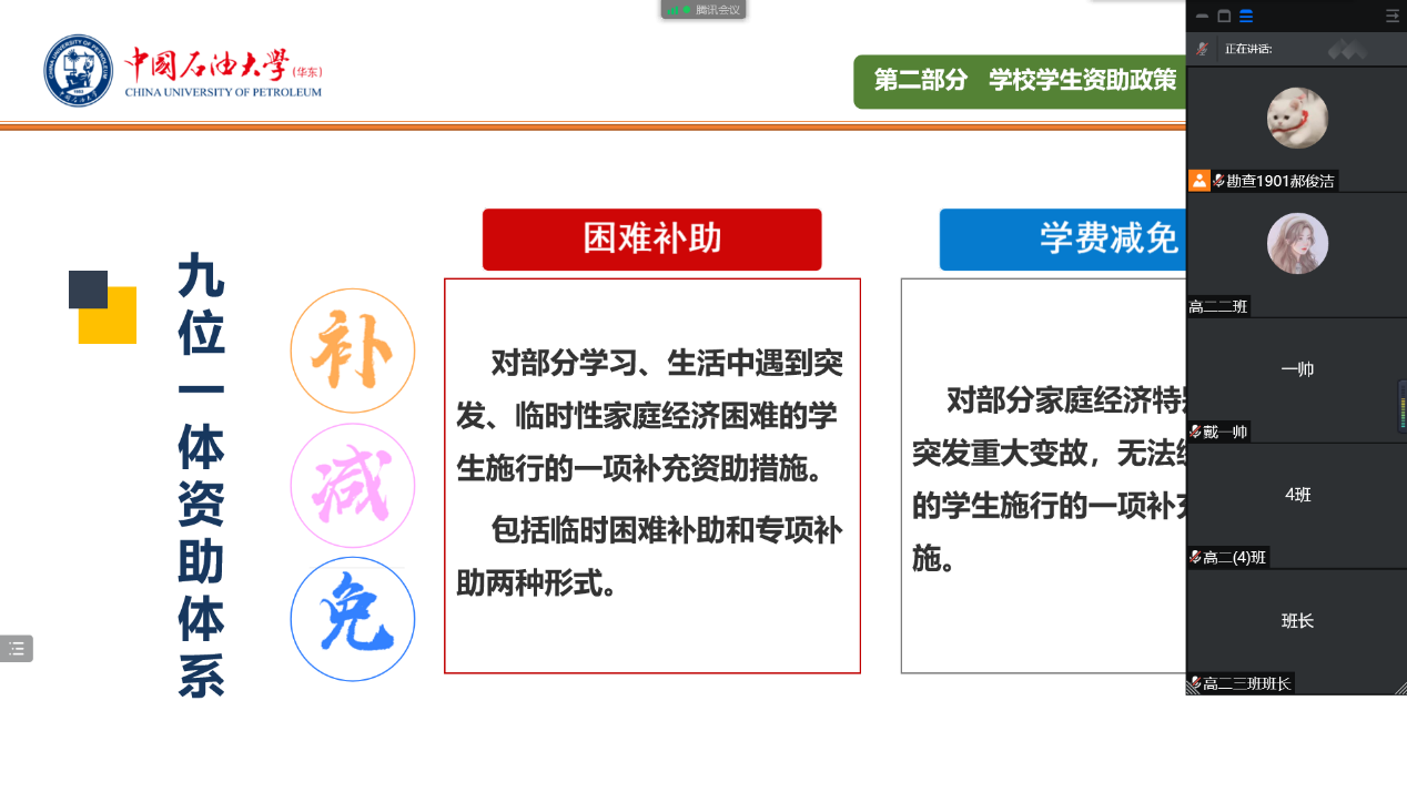 随后,宣传大使们向学生们详细介绍了国家对于贫困学生在教育方面的各种资助政策,包括国家奖学金、国家励志奖学金、国家助学金、国家助学贷款等等,重点介绍我校“奖、助、贷、勤、补、减、免、偿、险”九位一体资助体系以及学生资助政策中“绿色通道”等情况,并针对各项政策详细说明了获奖条件及申请方法。