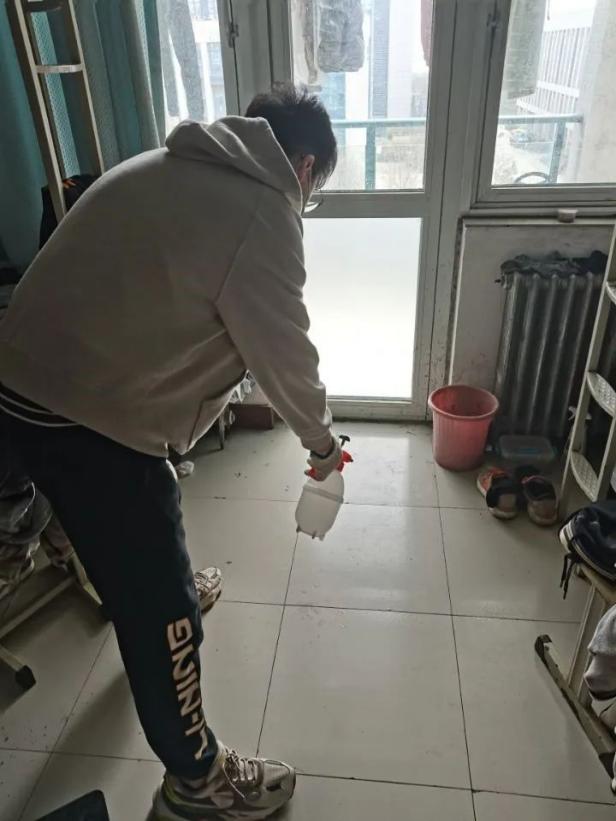 学生党员对宿舍进行消菌杀毒