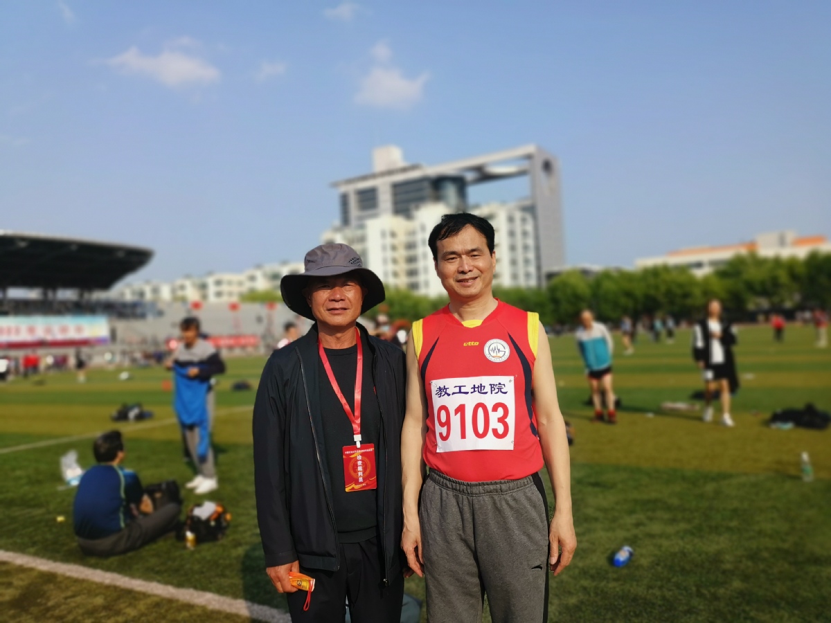 张军华、张世奇老师跳高合影。男甲跳高9人参赛,我跳完前面还有6人,心想今年肯定不得分,不巧前面有个免跳的跟腱断了,没得分,我捡了个第六名。