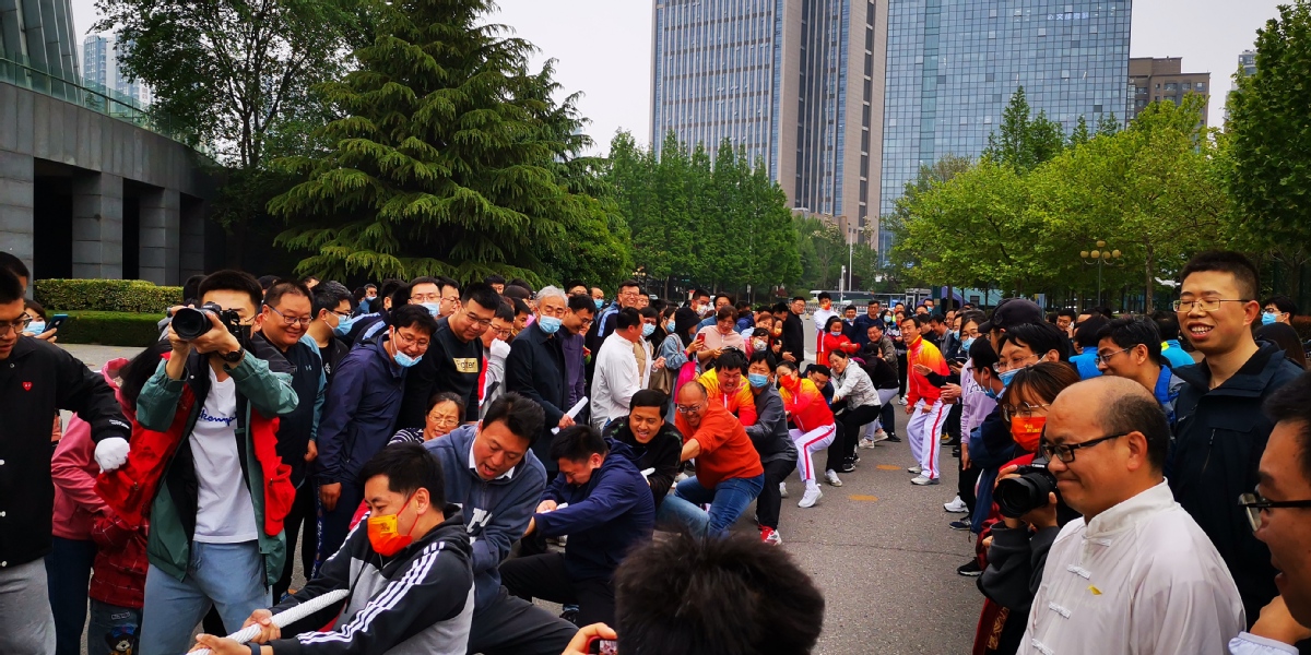 好家伙,拔河现场太热闹了,就想赶大集,人山人海。我们已找了比较壮的上去了,还是赶不上机关的腰粗。