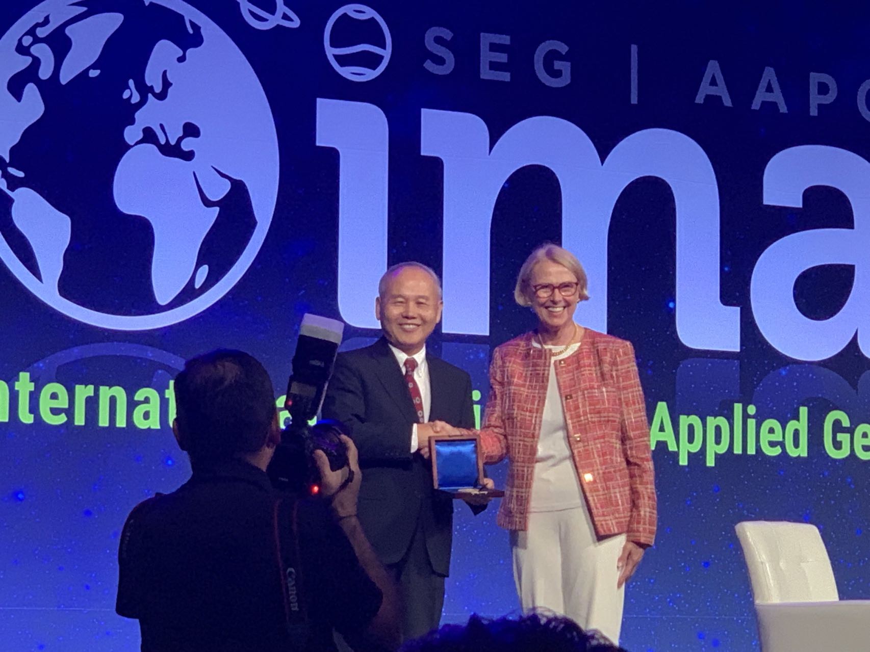 2022 SEG 主席Anna Shaughnessy 给朱宪怀颁发Kauffman 金奖