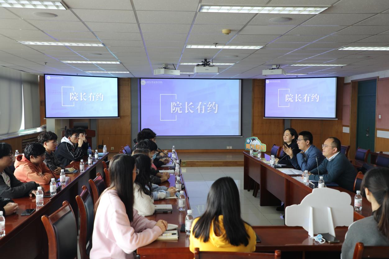 11月11日中午,秋风和煦,工科楼C座251会议室、757报告厅内暖意融融、气氛热烈,学院首期“院长有约”活动举行。“面向未来,我们将如何做好选择?”围绕这一主题,学院院长刘华,副院长宗兆云、苏远大、王健,党委副书记郑珊珊分别与50余名2020级优秀本科生代表共同探讨交流学涯规划。学院办公室主任王冠主持活动。