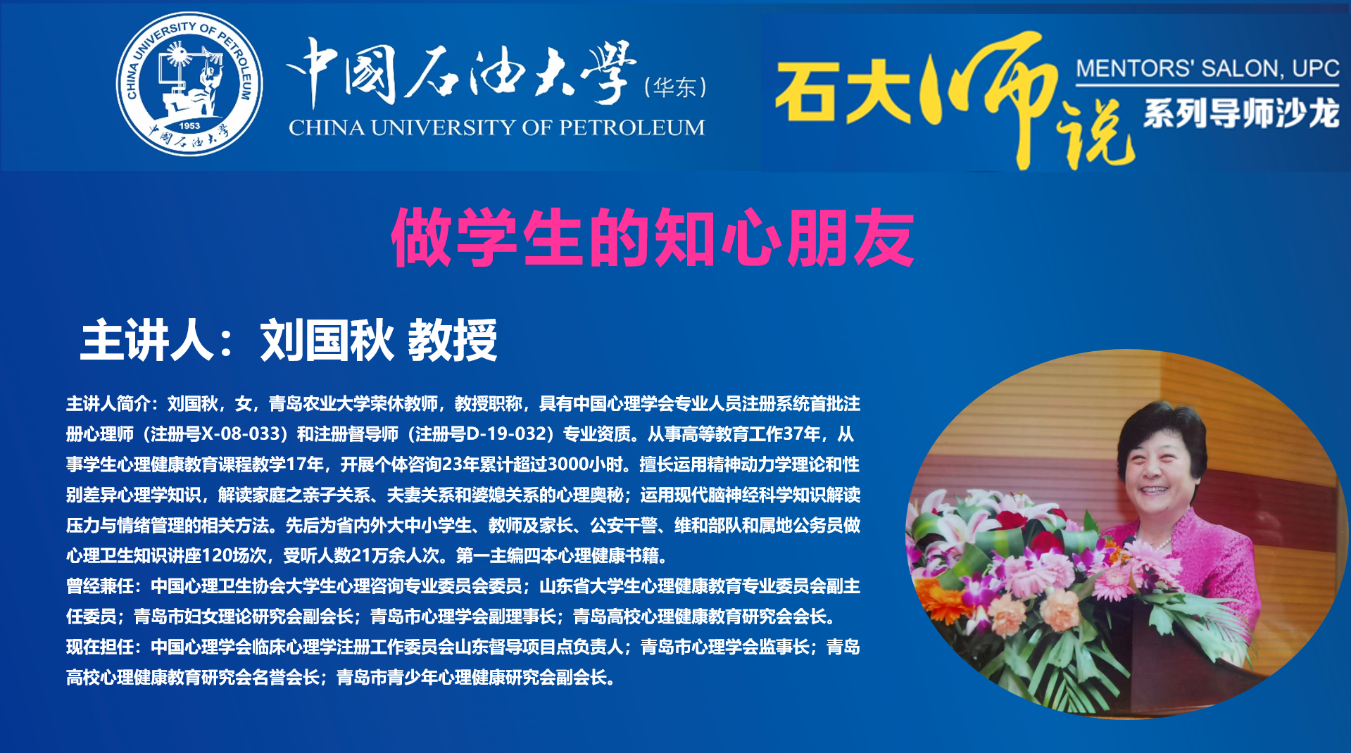 刘国秋,女,青岛农业大学原党委副书记,教授,具有中国心理学会专业人员注册系统首批注册心理师(注册号X-08-033)和注册督导师(注册号D-19-032)专业资质。从事高等教育工作37年,从事学生心理健康教育课程教学17年,开展个体咨询23年。擅长运用精神动力学理论和性别差异心理学知识,解读家庭之亲子关系、夫妻关系和婆媳关系的心理奥秘;运用现代脑神经科学知识解读压力与情绪管理的相关方法。先后为省内外大中小学生、教师及家长、公安干警、维和部队和属地公务员做心理卫生知识讲座120场次,受听人数21万余人次。第一主编四本心理健康书籍。曾经兼任:中国心理卫生协会大学生心理咨询专业委员会委员等职务,现任中国心理学会临床心理学注册工作委员会山东督导项目点负责人等职务。