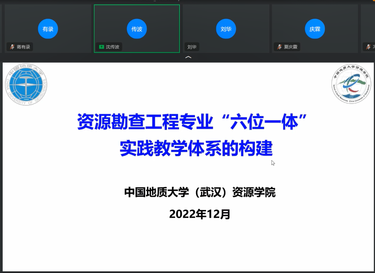 2022年12月25日,资源勘查工程专业教育部虚拟教研室举办了“实践教学体系构建”专题论坛,中国地质大学(武汉)资源学院副院长沈传波教授应邀作《资源勘查工程专业“六位一体”实践教学体系的构建》专题报告。专题论坛由beat365唯一官方网站院长刘华教授主持,来自中国石油大学、中国地质大学、中国矿业大学、西北大学等十余所高校的60余名教师参加了专题论坛。