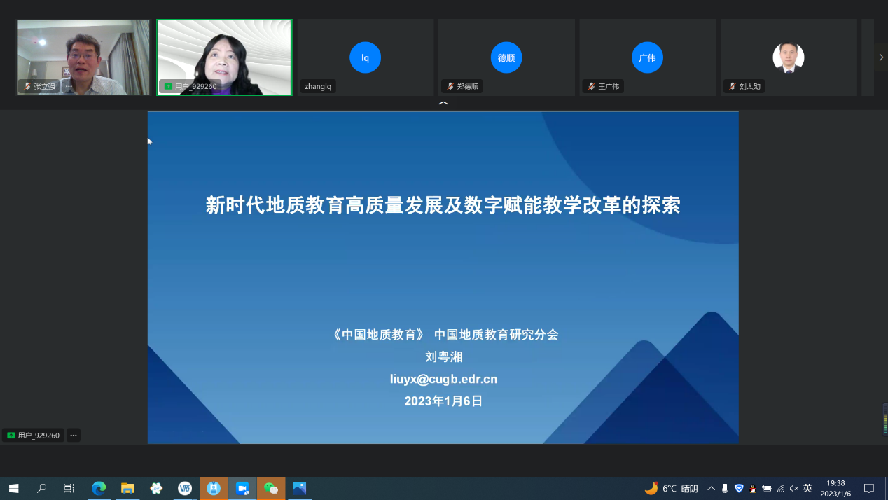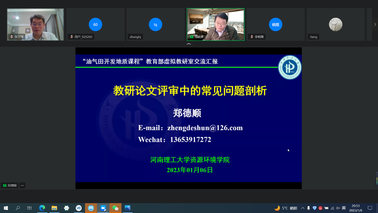 1月6日,教育部油气田开发地质课程虚拟教研室举办“教学研究和高质量教学论文”专题教研活动。beat365唯一官方网站张立强教授主持研讨会,邀请了《中国地质教育》常务副主编刘粤湘编审、河南理工大学资源环境学院副院长郑德顺教授作主题报告,来自beat365唯一官方网站、中国地质大学(武汉)、西北大学、山东科技大学、中国石油大学(北京)、西南石油大学、西安石油大学、中国矿业大学等20余所高校的50余位教师参加了本次研讨活动。