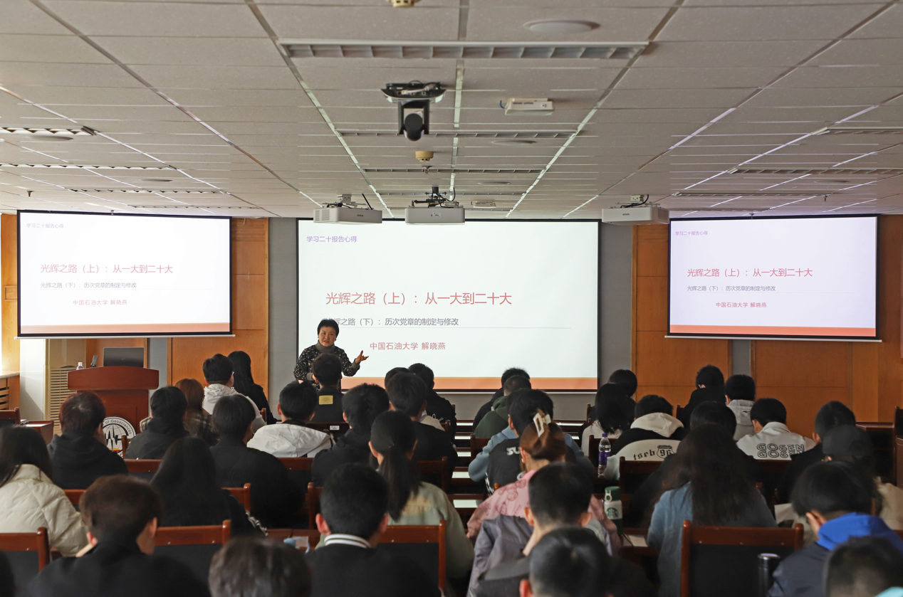 习近平总书记在党的二十大报告中指出,从现在起,中国共产党的中心任务就是全面建成社会主义现代化强国、实现第二个百年奋斗目标,以中国式现代化全面推进中华民族伟大复兴。关于如何理解中国式现代化,解晓燕认为这是中国共产党领导的社会主义现代化,既有各国现代化的共同特征,更有基于自己国情的中国特色。她从什么是现代化、现代化理论的诞生、现代化实现的客观标准、世界几次现代化浪潮的历史背景和基本特征等几个方面,为同学们讲解现代化的基本概念和“好的现代化道路”应该具备的四个标准。“中国式现代化属于中国,同样属于世界,它开辟了非西方国家独立自主探索现代化的新路,为其他发展中国家拓展了现代化新路径,为人类实现现代化提供了新选择。”她认为从世界范围来看,中国现代化道路打破了发展中国家现代化的“玻璃天花板”;打破了只有资本主义制度才能现代化的迷思;打破了西方列强现代化过程中的“国强必霸”悖论。