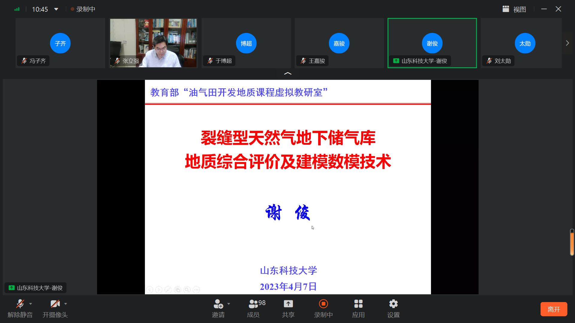 2023年4月7日晚,教育部“油气田开发地质课程虚拟教研室”举办了“教学公开课——专业前沿专题”活动,邀请了山东科技大学地质资源与地质工程博士点学术带头人,全国化工优秀科技工作者谢俊教授作了“裂缝型天然气地下储气库地质综合评级建模数模技术”的专题报告。专题论坛由beat365唯一官方网站《油田开发地质学》国家级课程思政示范课程和教育部“油气田开发地质课程虚拟教研室”负责人、山东省教学名师张立强教授主持,来自中国石油大学、中国地质大学、中国矿业大学、山东科技大学、西北大学、山东理工大学等十余所高校的100余名师生参加了专题论坛。
