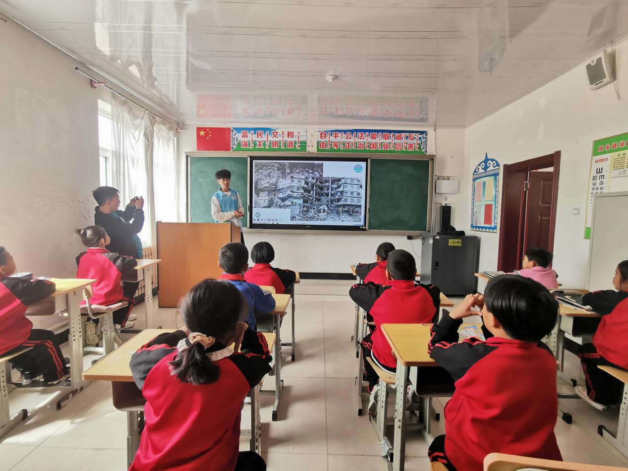 交流结束后,与会人员在青格乐吐校长的带领参观了校舍环境。春晖志愿服务队队长王建侨为小学的孩子们送上了一堂别开生面的地球探索科普教学。志愿者王建侨以“神奇的地震”为题讲解地震科普知识,寓教于乐之中,激发小朋友们对地质知识的热情和兴趣。在场学生积极思考并踊跃答题,课堂气氛热烈活跃。