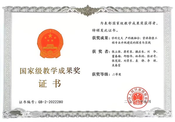 “学科交叉产科教融合:资源勘查工程专业升级建设的探索与实践”成果,依托“资源勘查工程专业升级建设的探索与实践”等国家级、省部级项目,强化需求导向、育人导向、资源导向、工程导向,构建并实践了“学科交叉、产科教融合,‘四要素’(培养方案、教师团队、专业课程、实践平台)重构”为核心的传统优势工科专业升级建设的有效途径,创建了“资源勘查+”专业人才培养新方案,构建了学科交叉、多主体协同的“资源勘查+”育人团队,创建了虚实结合的实践创新平台和实践教学体系,创新一流课程建设机制,实现了课程群精品化,示范引领了传统工科专业新工科升级建设。