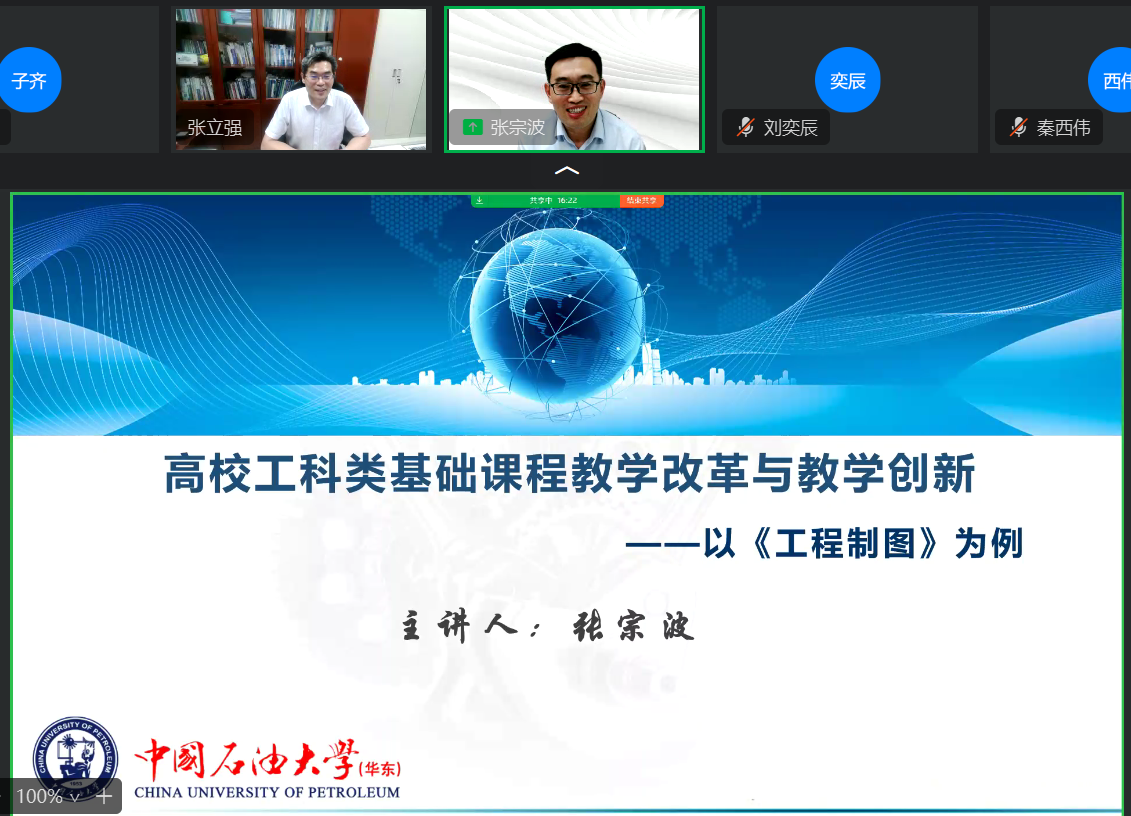 2023年9月8日晚,教育部“油气田开发地质课程虚拟教研室“举办课程教学创新及讲课比赛专题讲座,邀请了beat365唯一官方网站教授张宗波作题为《高校工科类基础课程教学改革与教学创新大赛—《工程制图》为例》的专题报告,资源系部分教师,以及来自山东科技大学、西北大学、中国地质大学(武汉)、贵州大学和河北工程大学等全国十余所高校科研院所70余人参加了线上会议,教育部虚拟教研室负责人、资源系主任张立强教授主持会议。