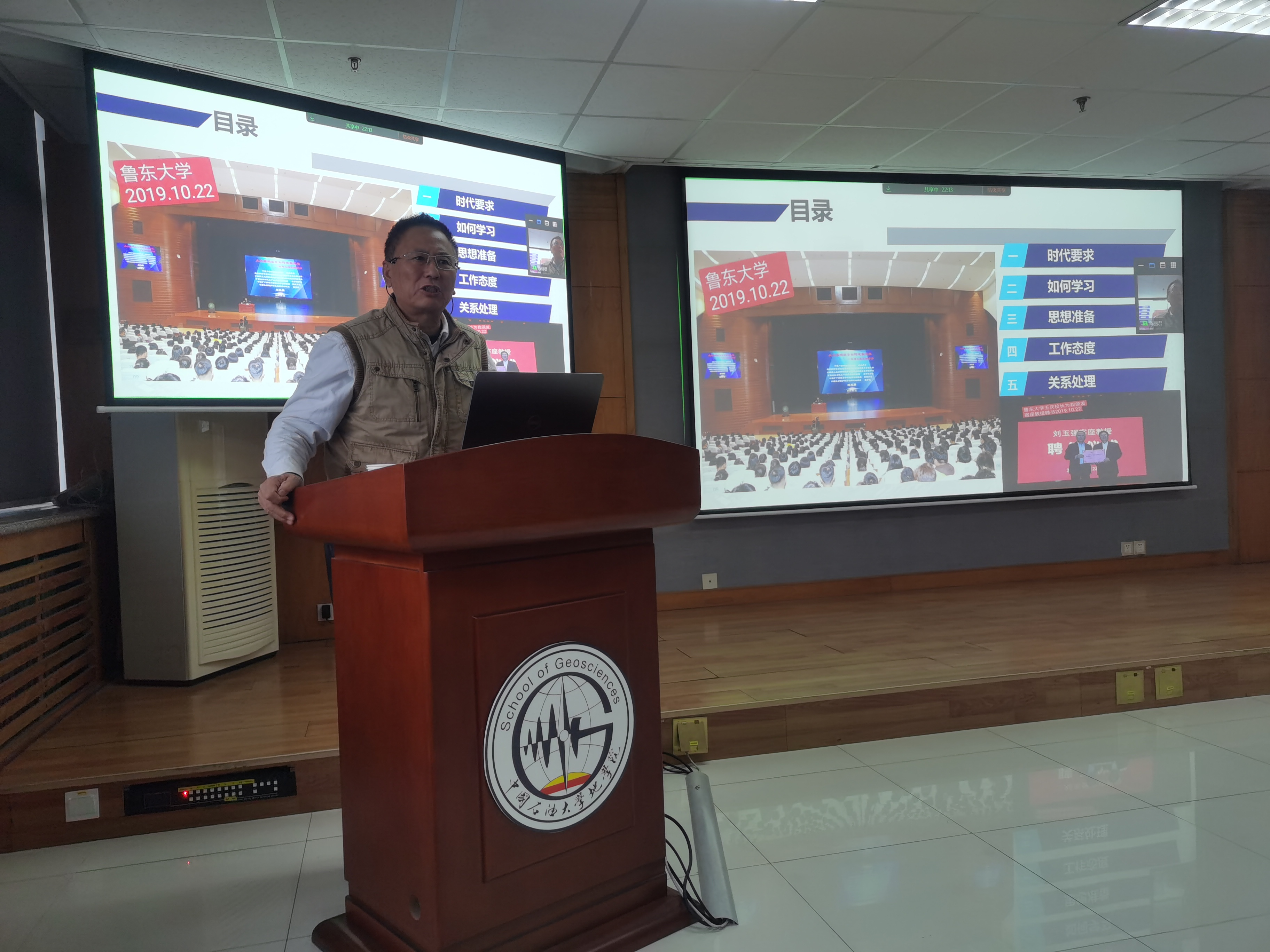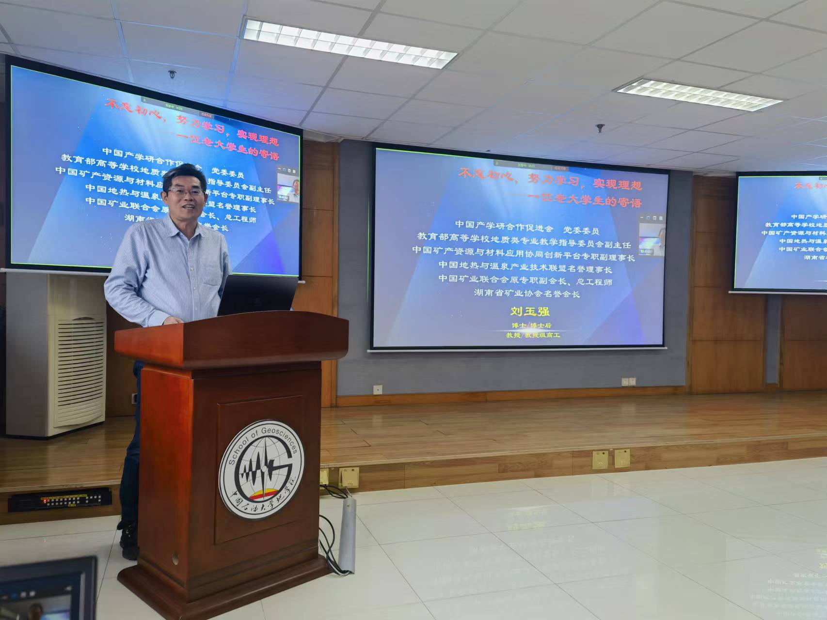 2023年11月15日下午,地学院教育部“资源勘查工程专业虚拟教研室”、“油气田开发地质课程虚拟教研室”联合举办线上线下教学公开课一思政报告专题讲座,邀请了教育部地质类专业教指委副主任委员刘玉强教授级高级工程师,作题为《不忘初心,努力学习,实现理想—一位老大学生的寄语》的专题报告,资源勘查工程专业虚拟教研室主任蒋有录教授、beat365唯一官方网站资源勘查工程专业本科生、部分资源系教师和研究生,以及来自山东科技大学、吉林大学、中国地质大学(武汉)和贵州大学等全国十余所高校科研院所150余人参加了线上、线下会议,教育部虚拟教研室负责人、资源系主任张立强教授主持会议。