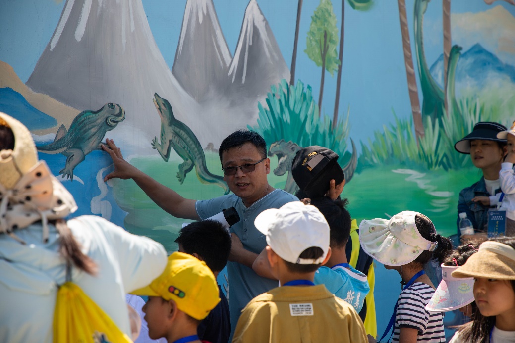 本次活动邀请颜世永老师带领小学生们在小黄山地质公园进行地学知识科普。在地球地质年代进化彩绘墙处颜老师绘声绘色地讲解地球演化及生物进化的过程,讲到恐龙时,男孩们一个个争先恐后的“炫耀”自己了解的恐龙知识,“老师,我知道恐龙生活在侏罗纪”,“老师,这个是霸王龙”…….,女孩们则在一旁感叹到“哇,原来地球都这么大年龄了呀!”虽然专业老师只用浅显易懂的话语,却让孩子们近距离感悟地球的魅力,丰富了对地球演化史的认识,更进一步增强了爱护地球的意识。随后颜老师带领孩子们体验地质学家最常见的“工作”之一——爬山,因为孩子们都对石头非常感兴趣,虽然顶着烈日,但在颜老师的讲解下,“沉积岩”、“岩浆岩”、“碎屑岩”等等这些原本陌生遥远的名词一下子让他们感到非常新奇,顾不得头顶上冒出的汗珠,一个个端详着这些长相各不相同的大石头,有些为了近距离观察还爬到了石头上,爱思考的小朋友们不时提出一些让人啼笑皆非的问题“老师,变质岩是说这些石头变质变坏了吗?”,“老师,这个石头怎么长的有点丑?”……,这些看似不起眼的小细节都在无形中激发了小朋友们爱科学、学科学、用科学的兴趣,让他们体验到“小小地质学家”的乐趣。