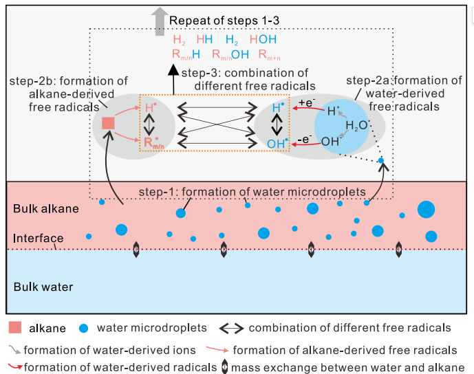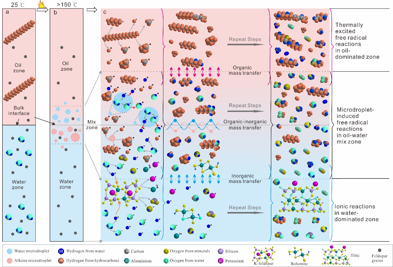 图3. 以水为桥梁的自由基和离子双重作用约束的烃-水-矿物相互作用和物质交换模式
