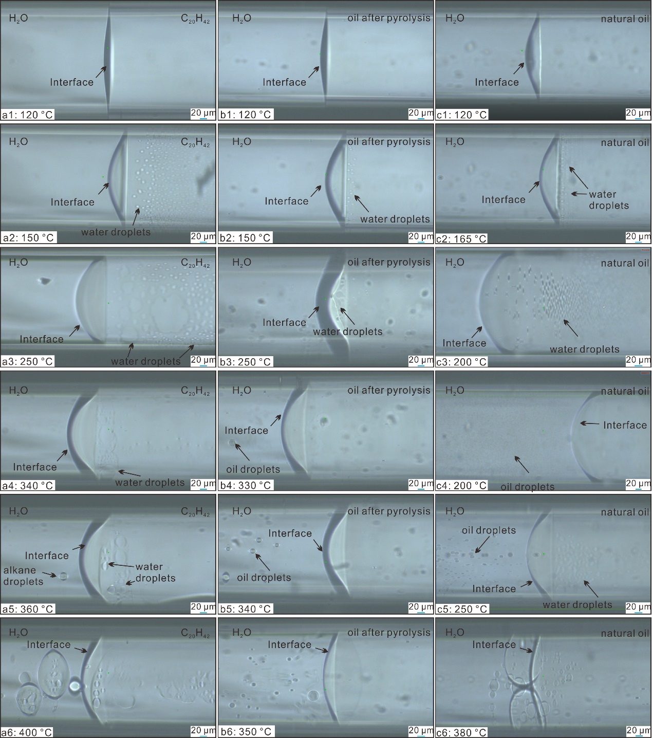 图1. 高温高压条件下不同油-水界面处水微滴的生成现象