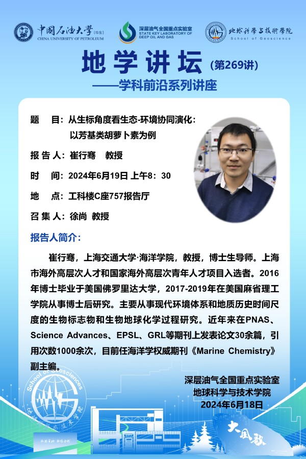 【地学讲坛第269讲】关于崔行骞教授《从生标角度看生态-环境协同演化:以芳基类胡萝卜素为例》学术报告的通知