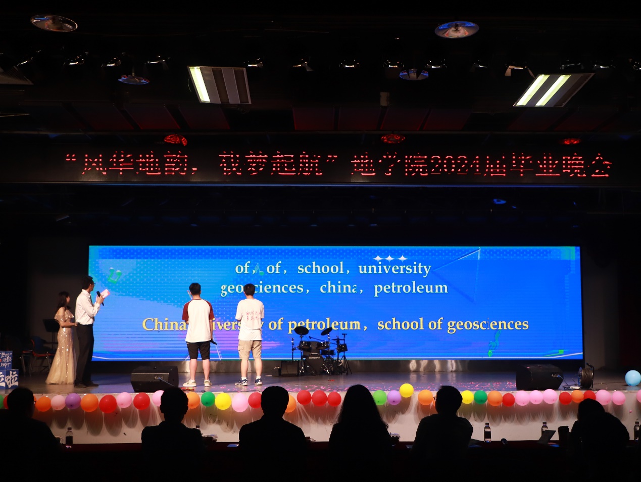 一波高潮后,晚会进入精彩有趣的“乱句重排”游戏环节,“勘天下、探未知、当尖兵、兴国家”“石大,没有你我可怎么活呀”、“我在石大很想你”等语句再一次让同学们回忆起与地学院的点滴时光。