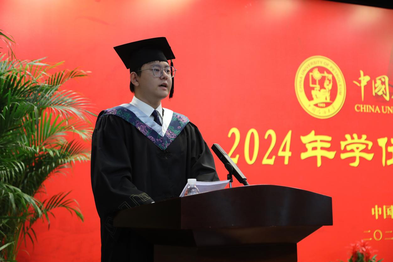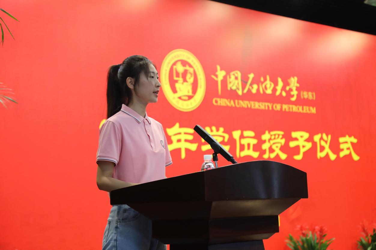 地质工程专业地物研2102班的倪雪彬作为研究生毕业生代表发言,分享了与石大和地学院相识、相知、相惜的美好记忆和成长感悟。她表示,学院“脚踏实地,胸怀全球”的院训、完善的培养体系以及良师益友驱散了她初始的不安,带给了她底气,帮助她逐渐找到目标和方向,继续扬帆起航奔赴下一段征程。