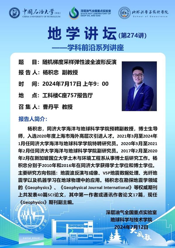【地学讲坛第274讲】关于杨积忠 副教授《随机梯度采样弹性波全波形反演》学术报告的通知