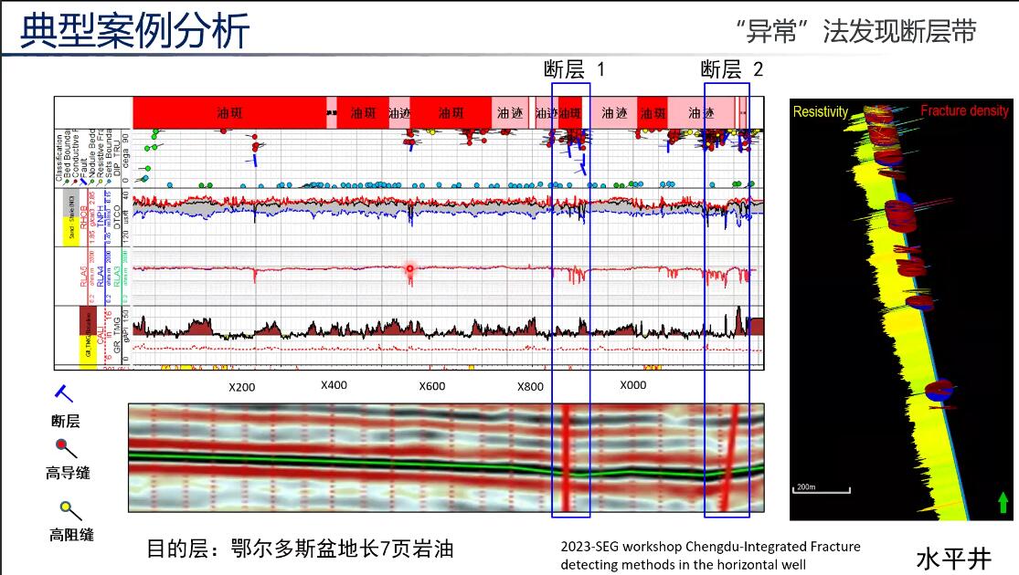 刘博在测井解释基本原理介绍的基础上,对不同含油气盆地存在的典型测井解释案例进行了全面介绍和分享。他重点介绍了通过“异常”法识别MTC,对我国南方深水陆棚相龙马溪组地质解释,并提出了块体搬运复合体的概念模型,同时针对龙马溪组页岩地层中发育多层呈低电阻率异常特征的“齿状”地层现象,结合岩心及区域地层背景认为,通过“异常”法识别了层理缝;在鄂尔多斯盆地长7页岩油解释过程中,“异常”法发现断层带。他最后与大家分享了测井解释工作经验,他表示测井曲线从不说谎,能够真实反映地下储层特征通过岩心、成像等刻度进行测井综合分析可以解决众多地质问题,保持一颗好奇之心是解决复杂地质问题的不二法门。