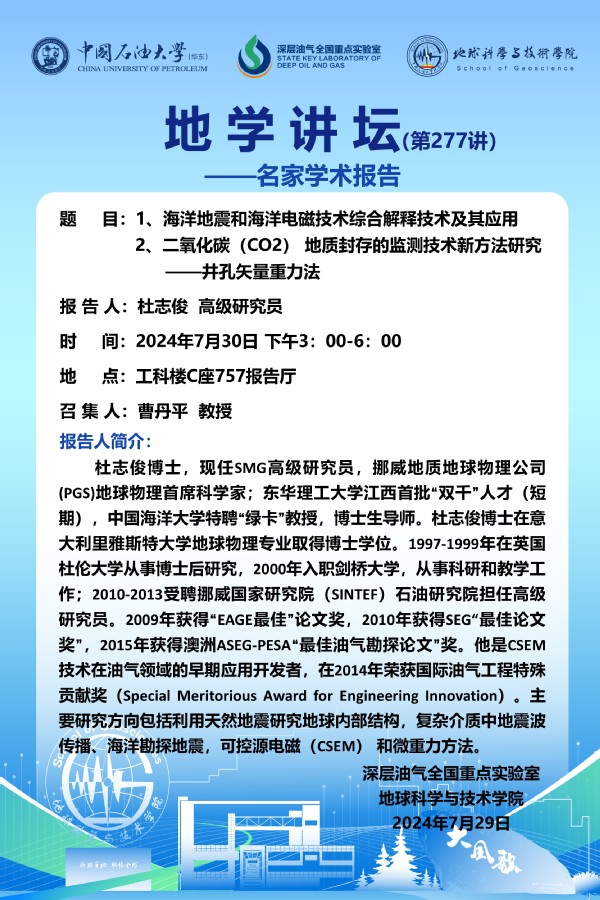 【地学讲坛第277讲】关于杜志俊 高级研究员《海洋地震和海洋电磁技术综合解释技术及其应用》及《二氧化碳(CO2) 地质封存的监测技术新方法研究 ——井孔矢量重力法》学术报告的通知