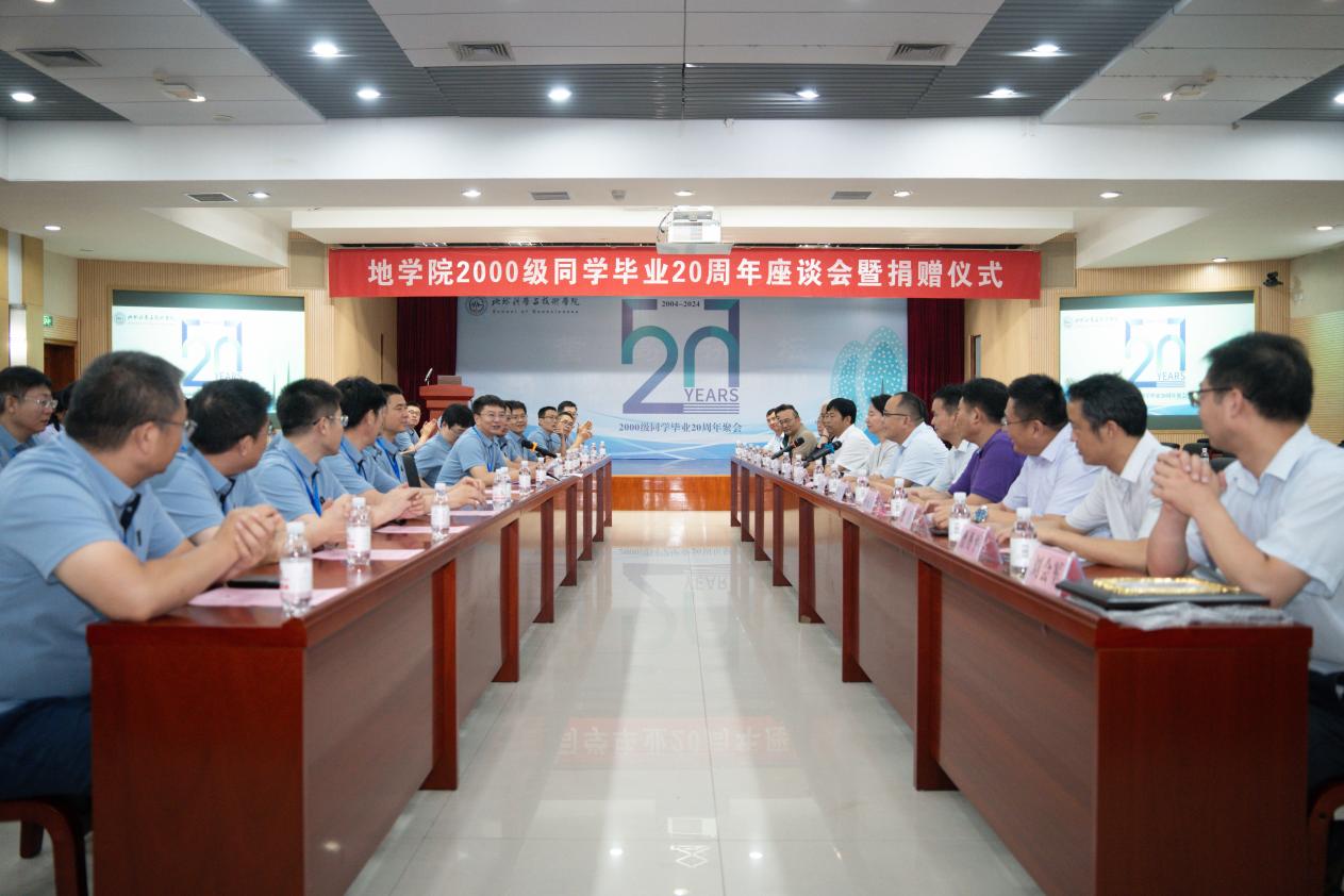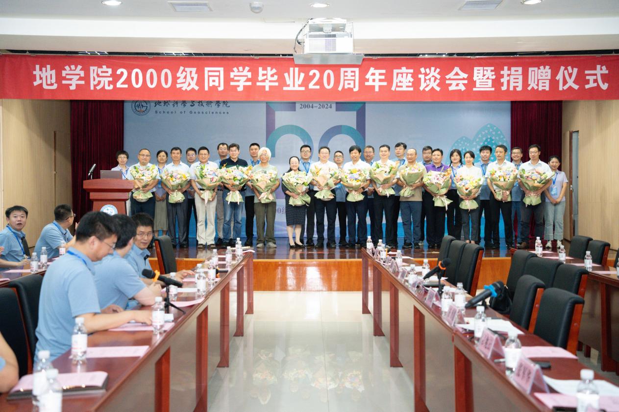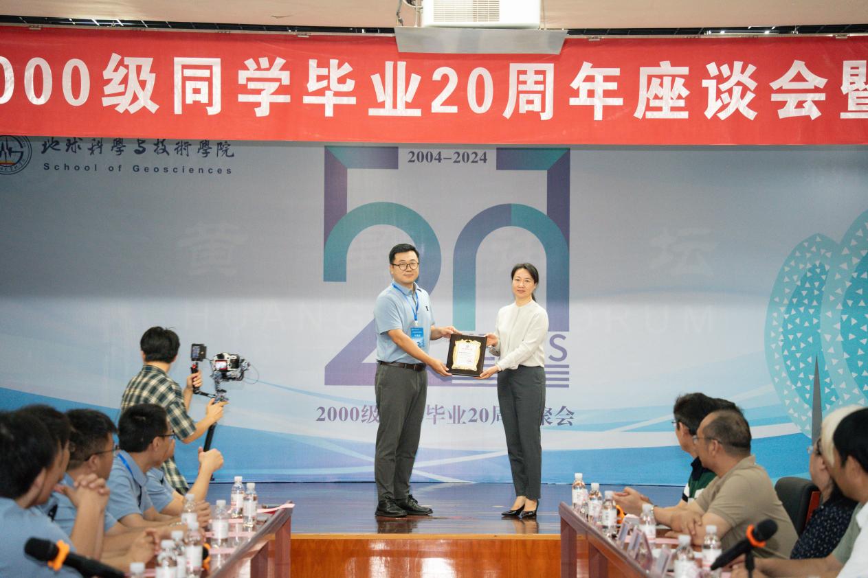 座谈会上,地学院2000级校友向学校捐赠了二十万元奖学金和一台实木地球仪。校友代表为昔日恩师献花,表达对老师在校期间谆谆教导的感激之情。