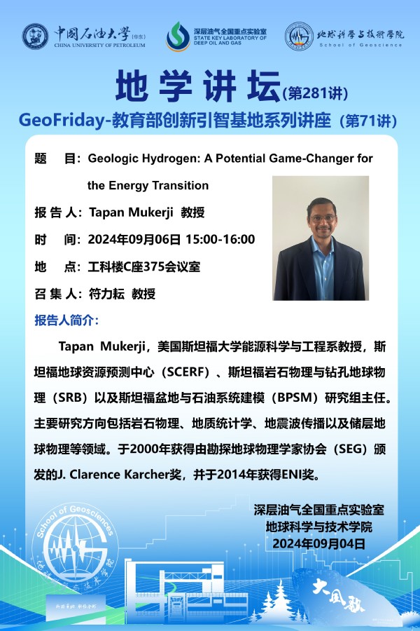 【地学讲坛第281讲】关于Tapan Mukerji教授《Geologic Hydrogen: A Potential Game-Changer for the Energy Transition》学术报告的通知