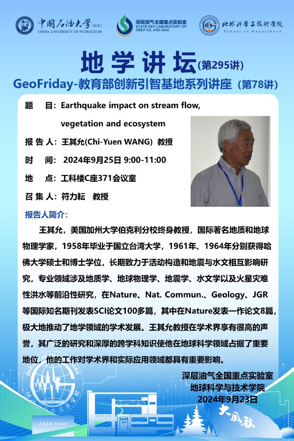 【地学讲坛第295讲】关于王其允(Chi-Yuen WANG) 教授《Earthquake impact on stream flow, vegetation and ecosystem》学术报告的通知