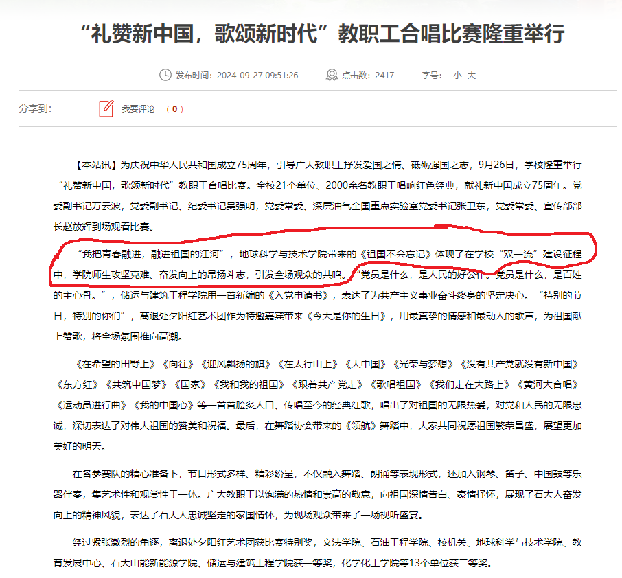 后记:本次大合唱圆满结束了,我们不禁要问,在茫茫的人海里,我是哪一个;在奔腾的浪花里,我是哪一朵。不需要你认识我,不渴望你知道我;我把青春融进,融进祖国的江河......让我们全院师生接续奋斗、顽强拼搏,一流学院不会忘记,伟大祖国不会忘记!在共和国75岁华诞来临之际,共同祝福学院的明天更美好!祖国的明天更好!